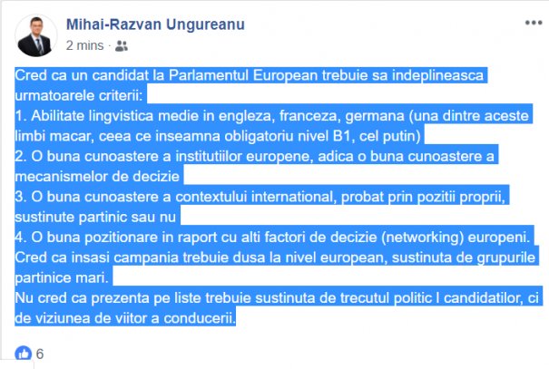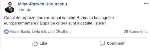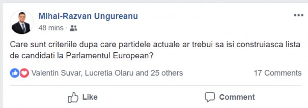 Capital a încercat să-l contacteze pe Mihai Răzvan Ungureanu, însă acesta a preferat să răspundă doar la comentariile câtorva internauţi de pe facebook. Interesant este că printre primii care i-au apreciat postarea este Liviu Iolu, fost purtător de cuvânt al Guvernului Cioloş. Acesta şi-a anunţat deja intenţia de a candida la europarlamentare din partea PULS, noul partid al lui Dacian Cioloş. Oare MRU va candida pe aceleaşi liste cu Dacian Cioloş? Este foarte posibil, mai ales că fostul comisar european a început să aibă probleme la capitolul imagine, după ce s-a aflat că face parte dintr-o familie care a avut conexiuni puternice cu serviciile de informaţii. Sau va vira spre Pro România, unde fostul general SIE, Silviu Predoiu este deja consilierul lui Victor Ponta?