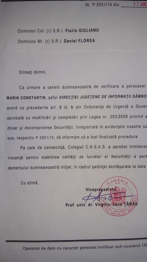 Nota redactiei: In urma verificarilor cerute de Gulianu si Florea (si nu de SRI, asa cum institutia este obligata de OUG nr. 24/2008 aprobata cu completari si modificari prin Legea nr. 293/2008), in lucrarea cu nr. P 2551/14, CNSAS a stabilit, in sfarsit, pe 22.08.2017, ca MARIN CONSTANTIN a fost lucrator al Securitatii ca organ represiv al regimului comunist si a incalcat drepturile si libertatile cetatenesti. Prin Sentinta nr. 4987/18.12.2017, Curtea de Apel Bucuresti a admis cererea de chemare în judecată formulate de CNSAS si a constată că pârâtul Marin Constantin a fost „lucrător al Securităţii” în sensul art. 2 lit. a din O.U.G. nr. 24/2008.