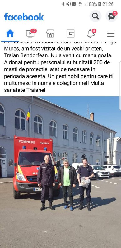 ISGU – Pompierii Mureș i-a mulțumit, de asemenea, public, lui Bendorfean pentru donație.