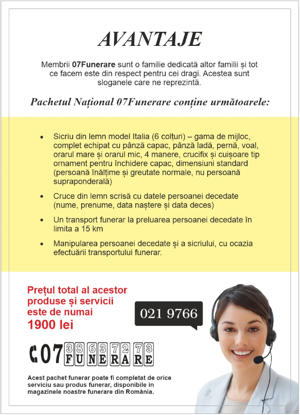 Cei de 07funerare va ofera in primul rand timpul necesar ca dumneavoastra sa duceti la indeplinire mai multe sarcini concomitente, pentru a putea finaliza totul cu succes. De exemplu, cu ajutorul lor puteti gasi un partener sau o societate din apropiere, ce ofera un pachet funerar si servicii funerare complete ideale nevoilor tale. Ei va pot pune la dispozitie pachetul funerar National 07Funerare, care cuprinde un sicriu executat cu lemn cu model de Italia, echipat cu accesoriile de trebuinta (perna, voal etc.), cruce cu datele defunctului, transportul si manipularea decedatului in limita a 15 km. Iar costurile acestui pachet sunt cele mai mici de pe piata, spre deosebire de alte firme care pot solicita chiar si dublul sau triplul acestei sume. Costurile tuturor necesitatilor pentru ritualul funerar de care puteti beneficia prin intermediul 07funerare sunt foarte avantajoase astfel incat, cu un buget redus, sa va puteti ocupa fara probleme de toate aspectele.