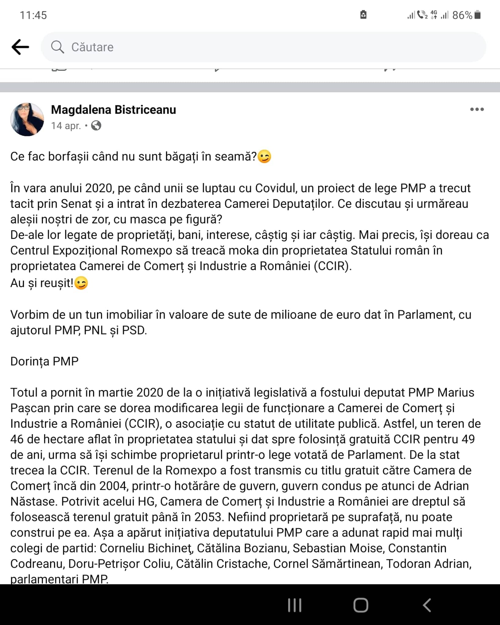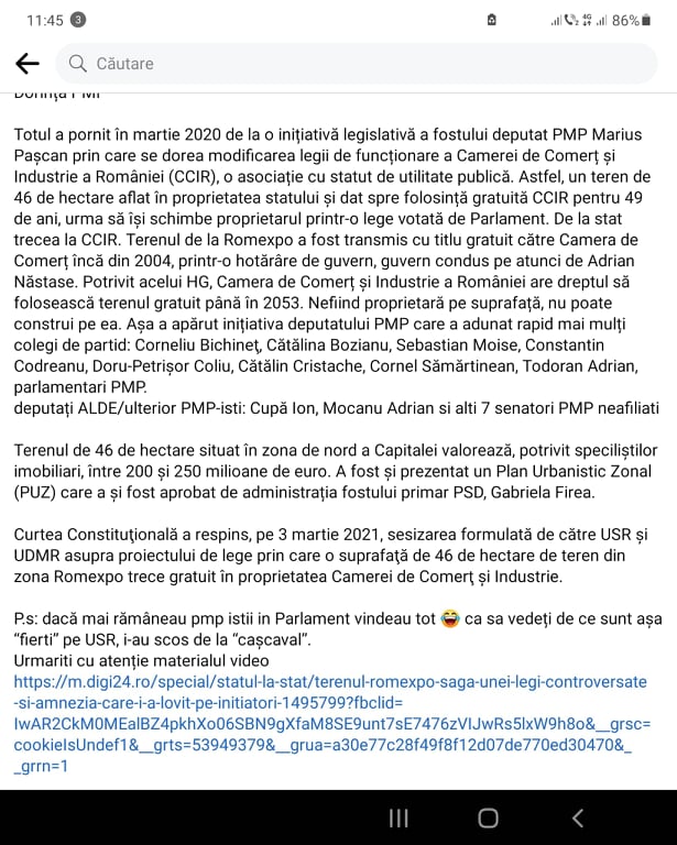 Vorbim de un tun imobiliar în valoare de sute de milioane de euro dat în Parlament, cu ajutorul PMP, PNL și PSD. Dorința PMP Totul a pornit în martie 2020 de la o inițiativă legislativă a fostului deputat PMP Marius Pașcan prin care se dorea modificarea legii de funcționare a Camerei de Comerț și Industrie a României (CCIR), o asociație cu statut de utilitate publică. Astfel, un teren de 46 de hectare aflat în proprietatea statului și dat spre folosință gratuită CCIR pentru 49 de ani, urma să își schimbe proprietarul printr-o lege votată de Parlament. De la stat trecea la CCIR. Terenul de la Romexpo a fost transmis cu titlu gratuit către Camera de Comerț încă din 2004, printr-o hotărâre de guvern, guvern condus pe atunci de Adrian Năstase. Potrivit acelui HG, Camera de Comerț și Industrie a României are dreptul să folosească terenul gratuit până în 2053. Nefiind proprietară pe suprafață, nu poate construi pe ea. Așa a apărut inițiativa deputatului PMP care a adunat rapid mai mulți colegi de partid: Corneliu Bichineţ, Cătălina Bozianu, Sebastian Moise, Constantin Codreanu, Doru-Petrişor Coliu, Cătălin Cristache, Cornel Sămărtinean, Todoran Adrian, parlamentari PMP. deputați ALDE/ulterior PMP-isti: Cupă Ion, Mocanu Adrian si alti 7 senatori PMP neafiliati Terenul de 46 de hectare situat în zona de nord a Capitalei valorează, potrivit speciliștilor imobiliari, între 200 și 250 milioane de euro. A fost și prezentat un Plan Urbanistic Zonal (PUZ) care a și fost aprobat de administrația fostului primar PSD, Gabriela Firea. Curtea Constituţională a respins, pe 3 martie 2021, sesizarea formulată de către USR şi UDMR asupra proiectului de lege prin care o suprafaţă de 46 de hectare de teren din zona Romexpo trece gratuit în proprietatea Camerei de Comerţ şi Industrie. P.s: dacă mai rămâneau pmp istii in Parlament vindeau tot ca sa vedeți de ce sunt așa “fierti” pe USR, i-au scos de la “cașcaval”.