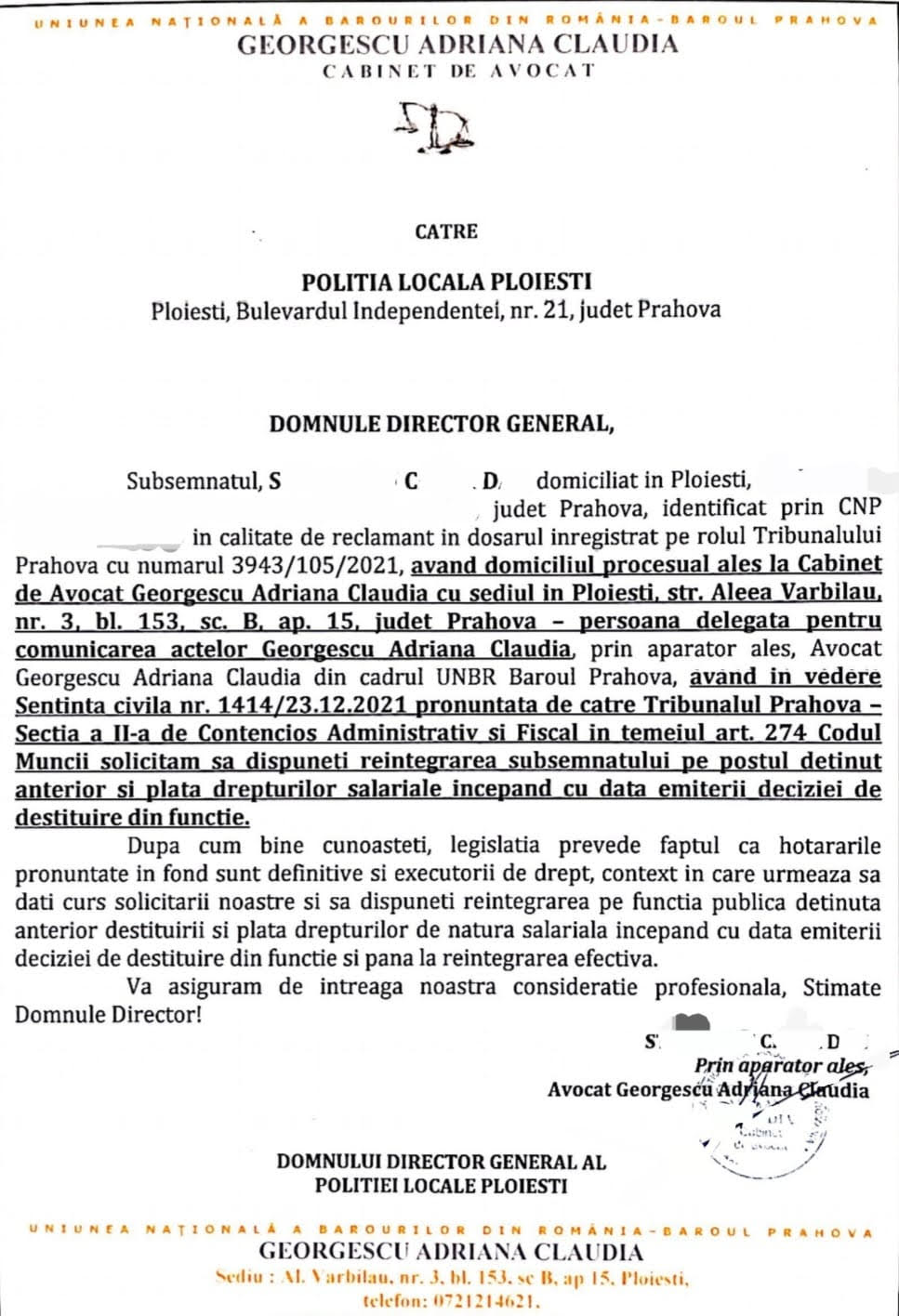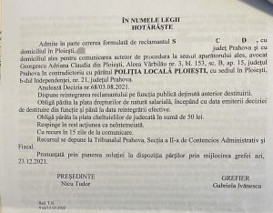 Totodata, acesta s-a adresat si instantei, in civil, unde – prin Hotarârea 2831/2021 a Tribunalului Prahova care a fost emisa in data de 16.11.2021, o hotarare prin care reclamantul a castigat din nou despăgubiri egale cu salariile indexate, majorate si reactualizate si cu celelalte drepturi de care ar fi beneficiat pe întreagă perioadă de suspendare a contractului individual de muncă si reancadrarea pe postul de functionar public detinut anterior la achizitii din cadrul Politiei Locale Ploiesti.