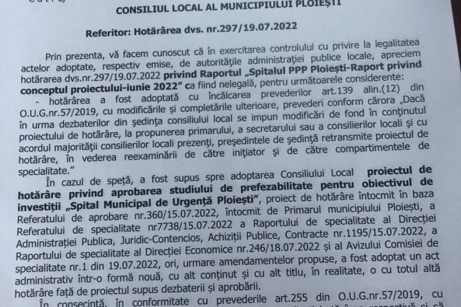 Aflam dintr-un comunicat bizar ca ” Prefectura Prahova a decis ca fiind NELEGALE amendamentele aduse la proiectul construirii Spitalului Municipal de Urgenta”!