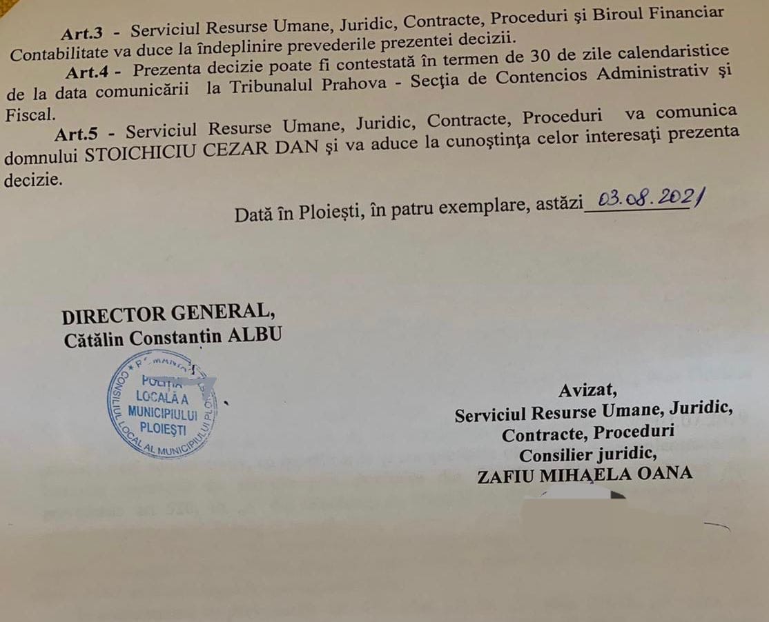 Pe scurt, Politia Locala Ploiesti dupa ce a emis decizia nr 67 prin care S.C.D este reangajat conform deciziei definitive ale instantei cu plata salariilor pe o perioada de peste 5 ani de zile, trebuia să il introduca în comisia de disciplină pe S.C.D in baza adreselor de la Agenția Națională de Integritate și Agenția Națională a Funcționarilor Publici .