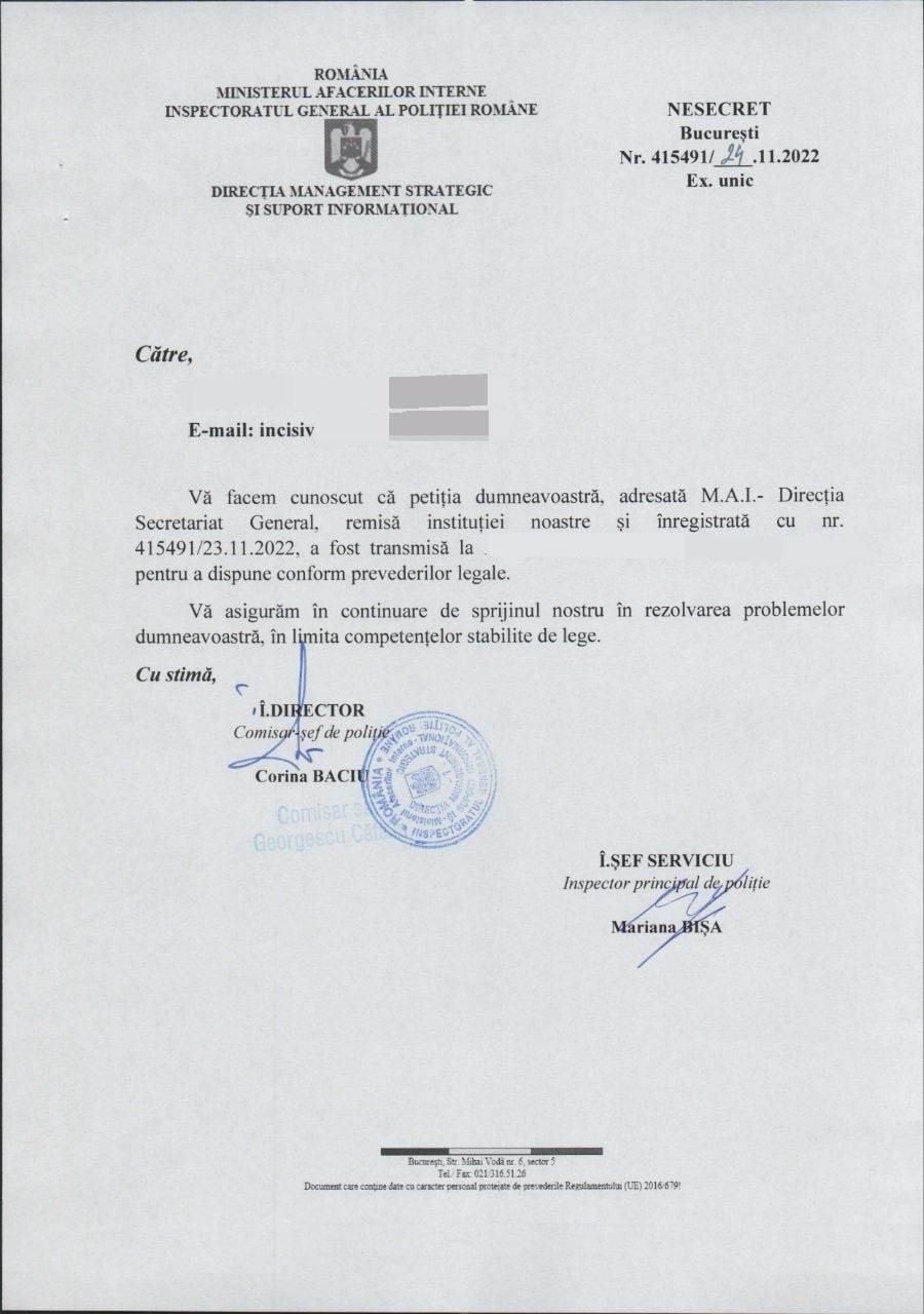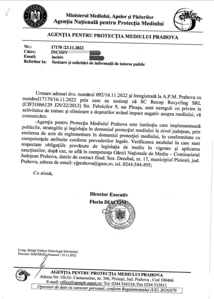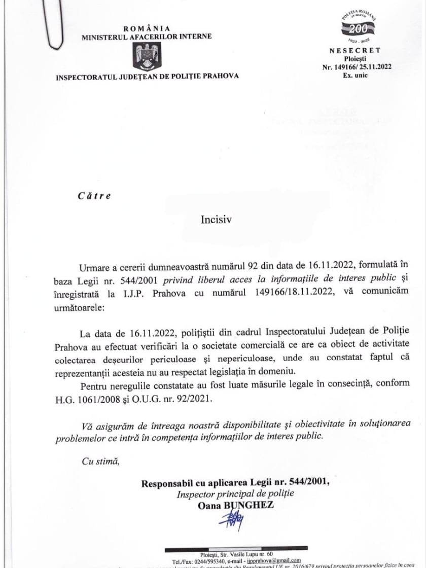 Nu am publicat raspunsurile IPJ Prahova si modul operativ in care aceasta institutie si-a facut datoria (chiar daca confirma in totalitate dezvaluirile noastre) pentru a monitoriza reactiile Recop Recycling SRL Pleasa si ale interlopului Muresan Catalin (atat noi cat si organele de specialitate).