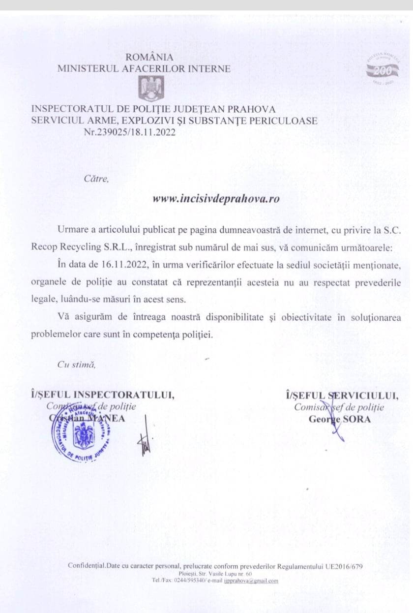 La data de 18.11.2022, organele de cercetare penala din cadrul IPJ Prahova, prin adresa nr 239025/18.11.2022, au confirmat dezvaluirile ziarului Incisiv de Prahova cu privire la “Bomba ecologica de la Pleasa”, precizand in clar: reprezentantii Recop Recycling SRL Pleasa NU au respectat prevederile legale!