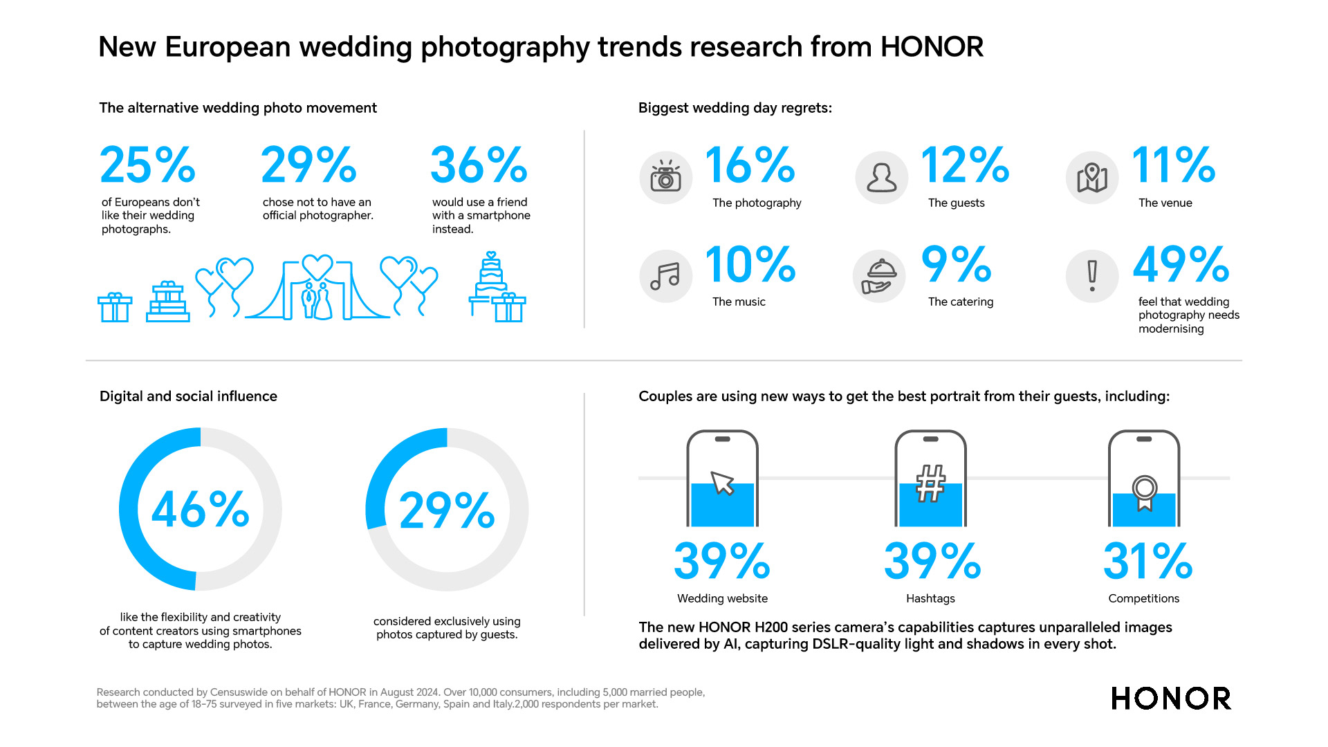 [București, România – 19 August 2024] – Rezultatele unei noi cercetări dezvăluie tendința tot mai populară a fotografiei alternative de nuntă: 25% dintre europeni recunosc că nu sunt mulțumiți de fotografiile de la propria nuntă, iar 29% aleg să nu aibă un fotograf oficial. Peste o treime (36%) ar lua în considerare să aibă ca fotograf un prieten priceput în utilizarea smartphone-ului.