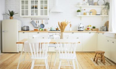 Stylish Scandinavian kitchen interior: chairs and table in foreground, fridge, long wooden counter with machines, utensils on shelves in background. Interiors, design, ideas, home and coziness...